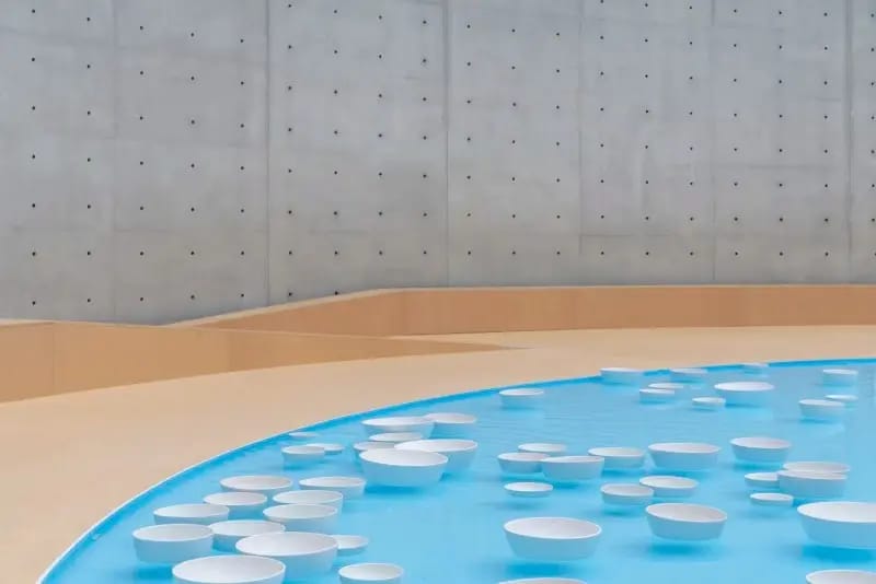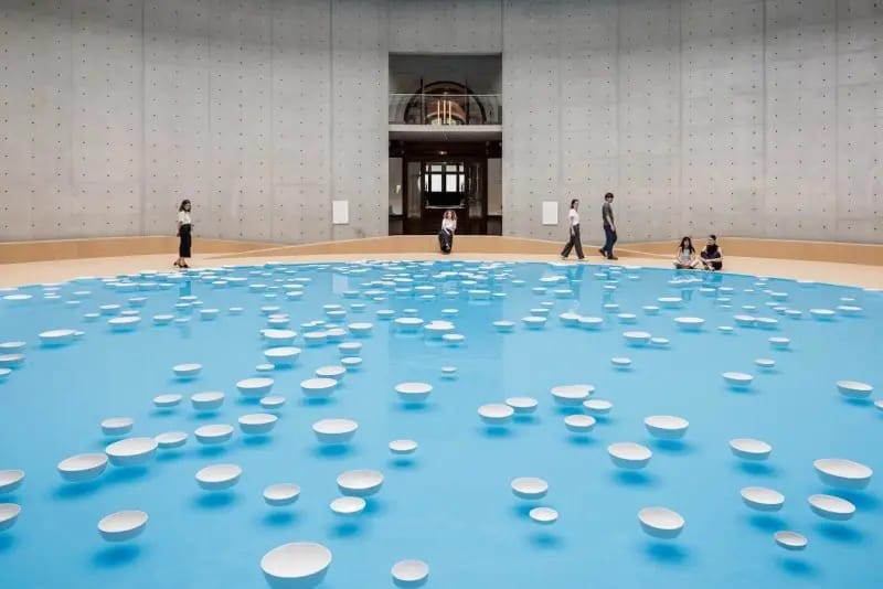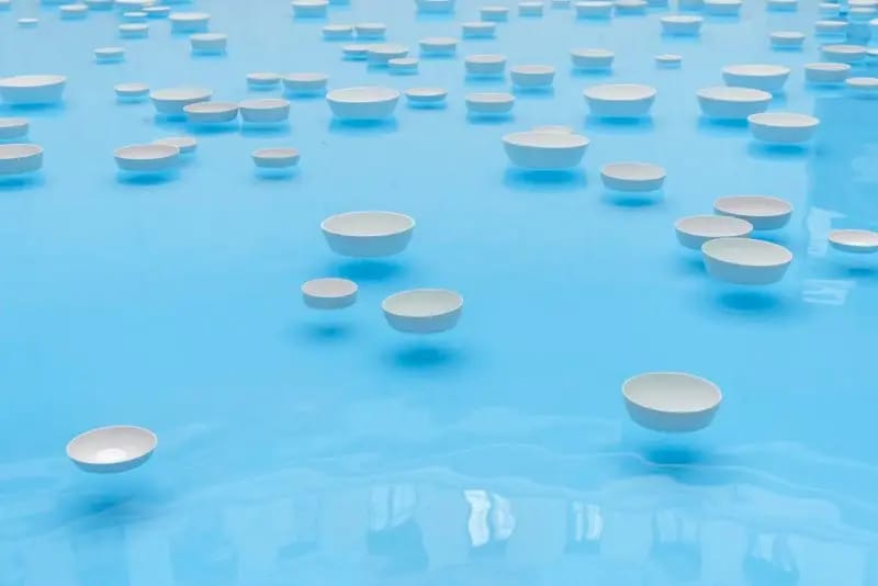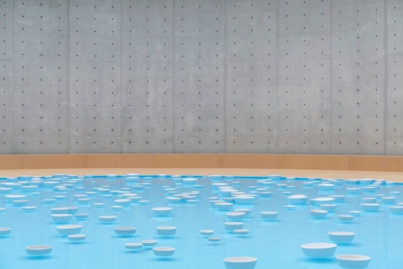 The piece consists of over 200 white porcelain bowls gently drifting across a vast circular pool of water.