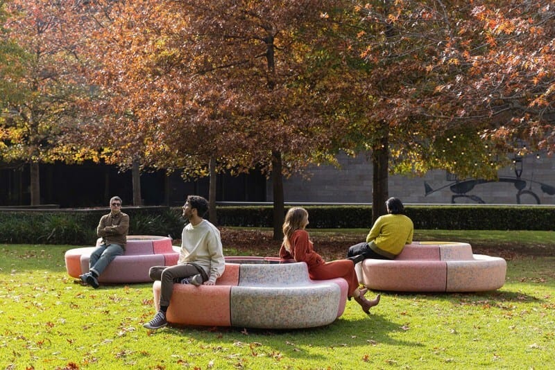 Made from speckled recycled plastic, the friendly approachable bench features a flower petal design that invites you to plunk down and think about the world.