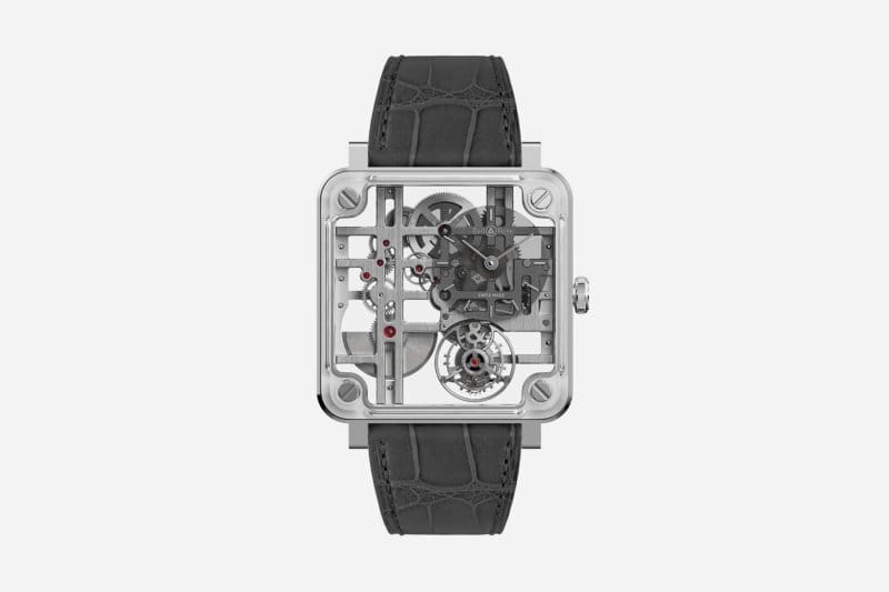 At first glance, it’s all geometry and transparency, a square frame holding a floating movement, a little mechanical world exposed on purpose.