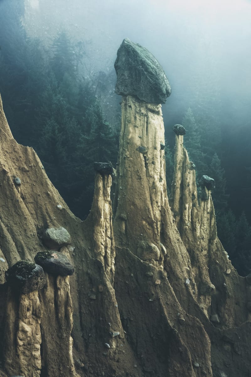 The structures are created by erosion, rising from clay soil left behind by glaciers from the last Ice Age. Each features a large boulder resting on top which protects the soil below. Eventually the tall columns lose the strength to hold the large rock overhead, shifting balance and sending it tumbling down the mountain.
