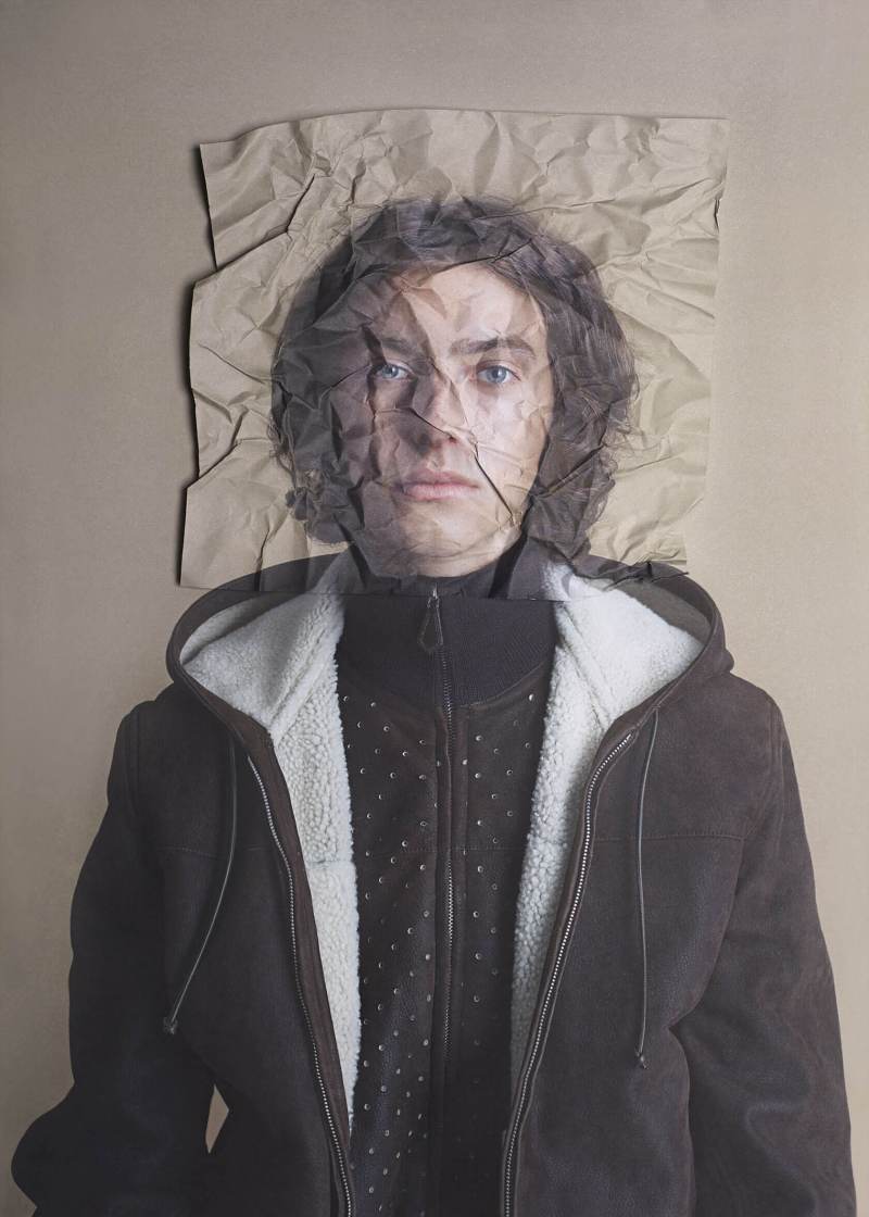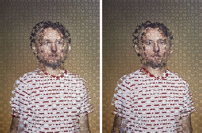 We see portraits crumpled, cut into puzzle pieces, and folded like origami. The deconstruction makes ordinary into something disjointed and unfamiliar.
