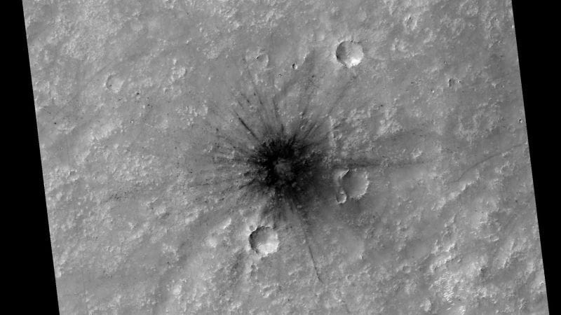 NASA’s Mars Reconnaissance Orbiter recently used its High-Resolution Imaging Science Experiment (HiRISE) to snap a beautifully crisp photo of the Martian surface. Taken from 158 miles above the surface, the crater is located in the Valles Marineris region. It shows how much material has been excavated by the impact of the crater, possibly showcasing subterranean ice below.