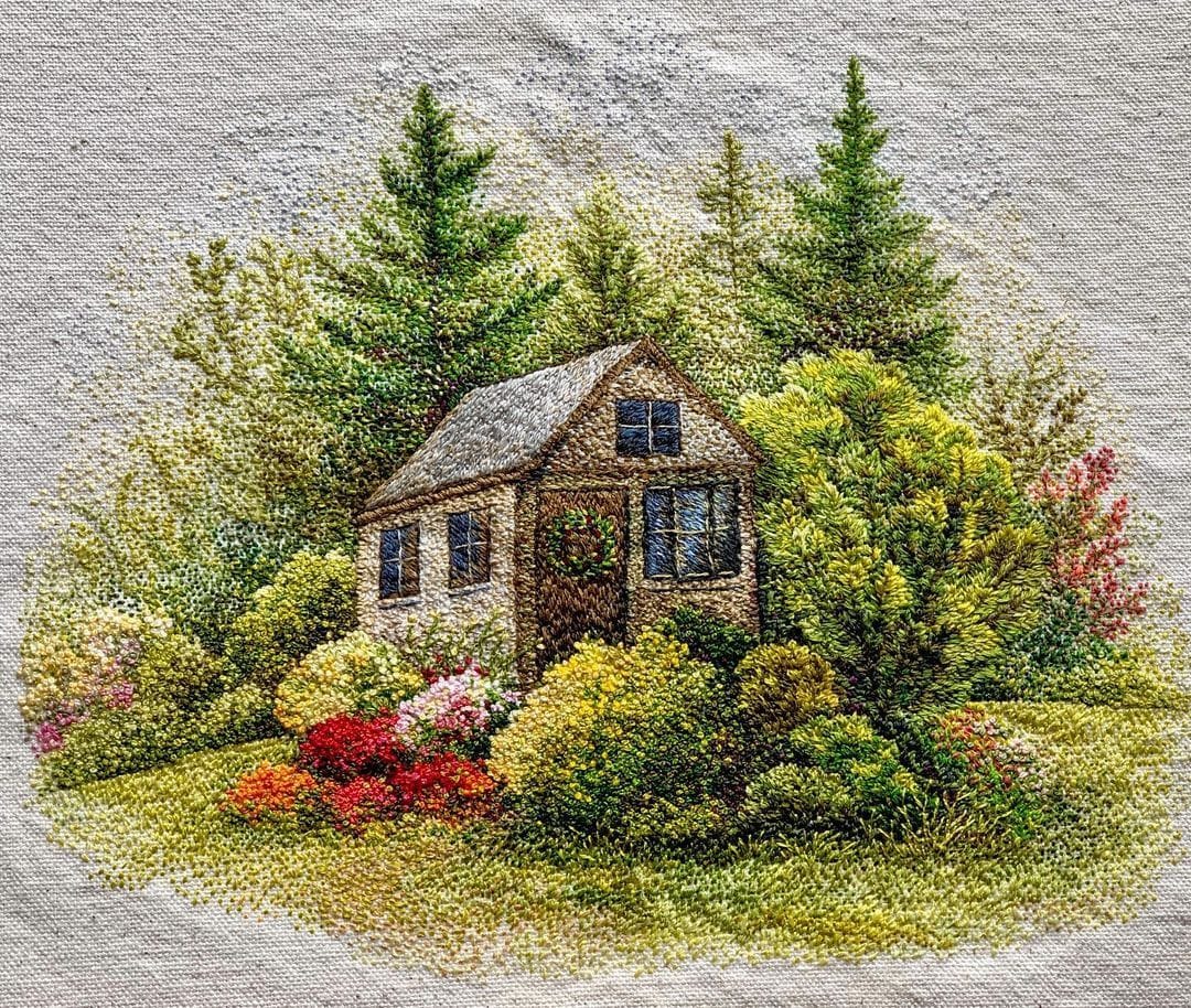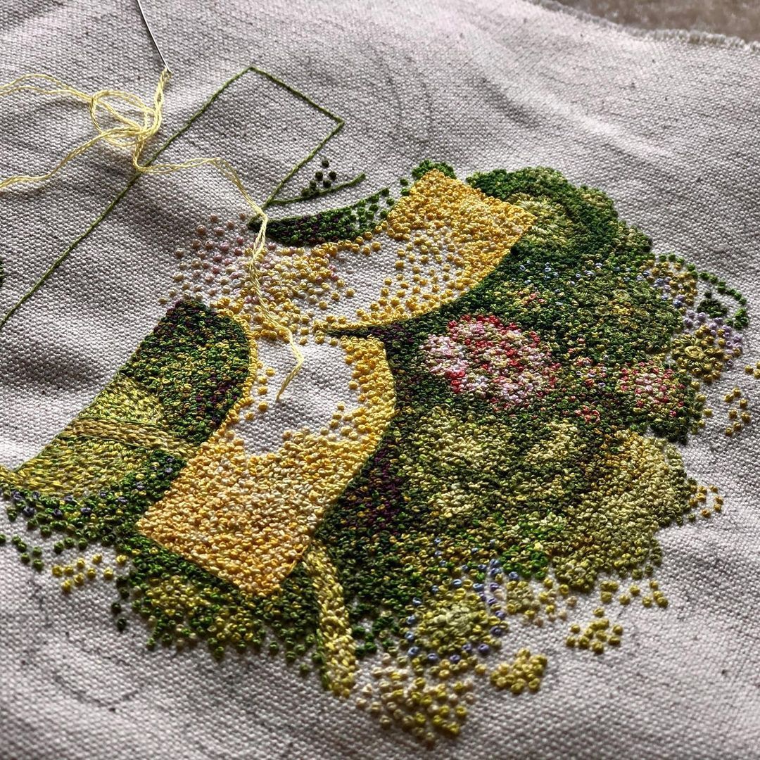 From dense fall foliage colors to detailed gardens with moss and flowers, we are amazed by her skill using nothing but needle and thread.