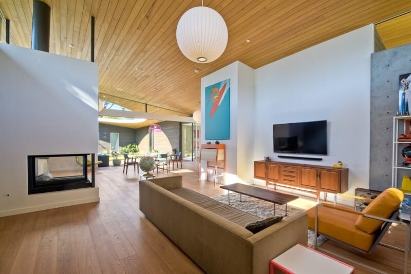 Situated just a few blocks from the beach, this modern gem has an avocado pit divot cut out of it’s roof, creating a curving roofline that also blends the inside and outside elements beautifully.