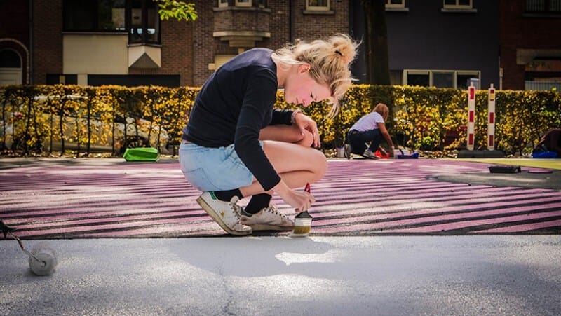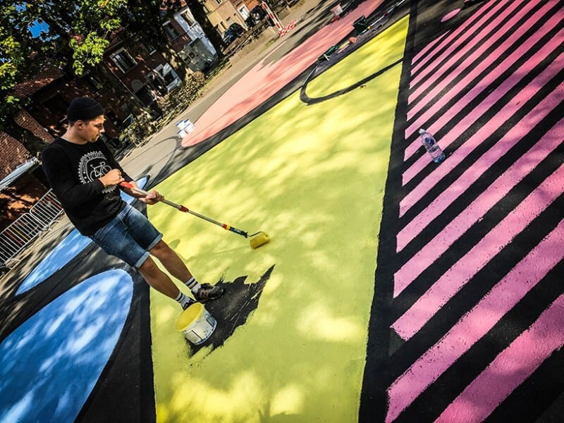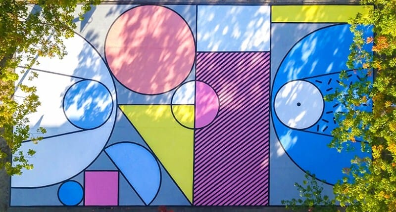 Muralist Katrien Vanderlinden inspired an entire neighborhood with a revitalized basketball court across from a school in Aalst, Belgium. Using over 130 liters of paint, her work is a collection of geometric shapes and patterns, coming together in vibrant and graphic design. H/T DesignBoom: