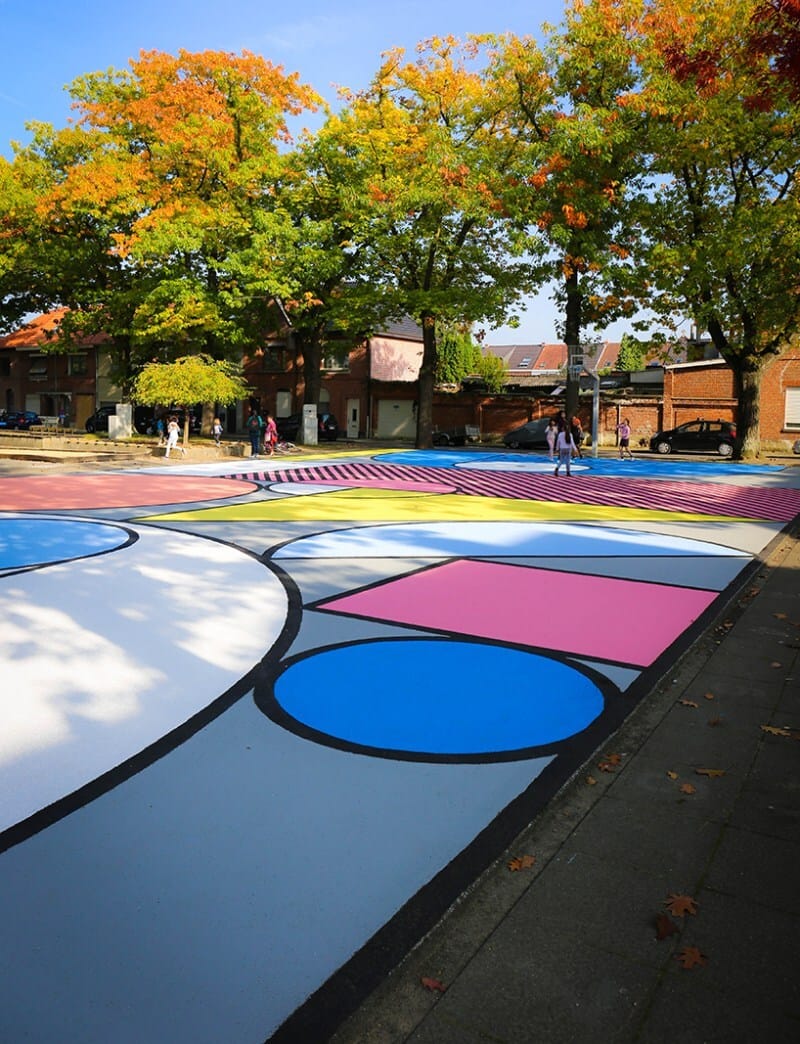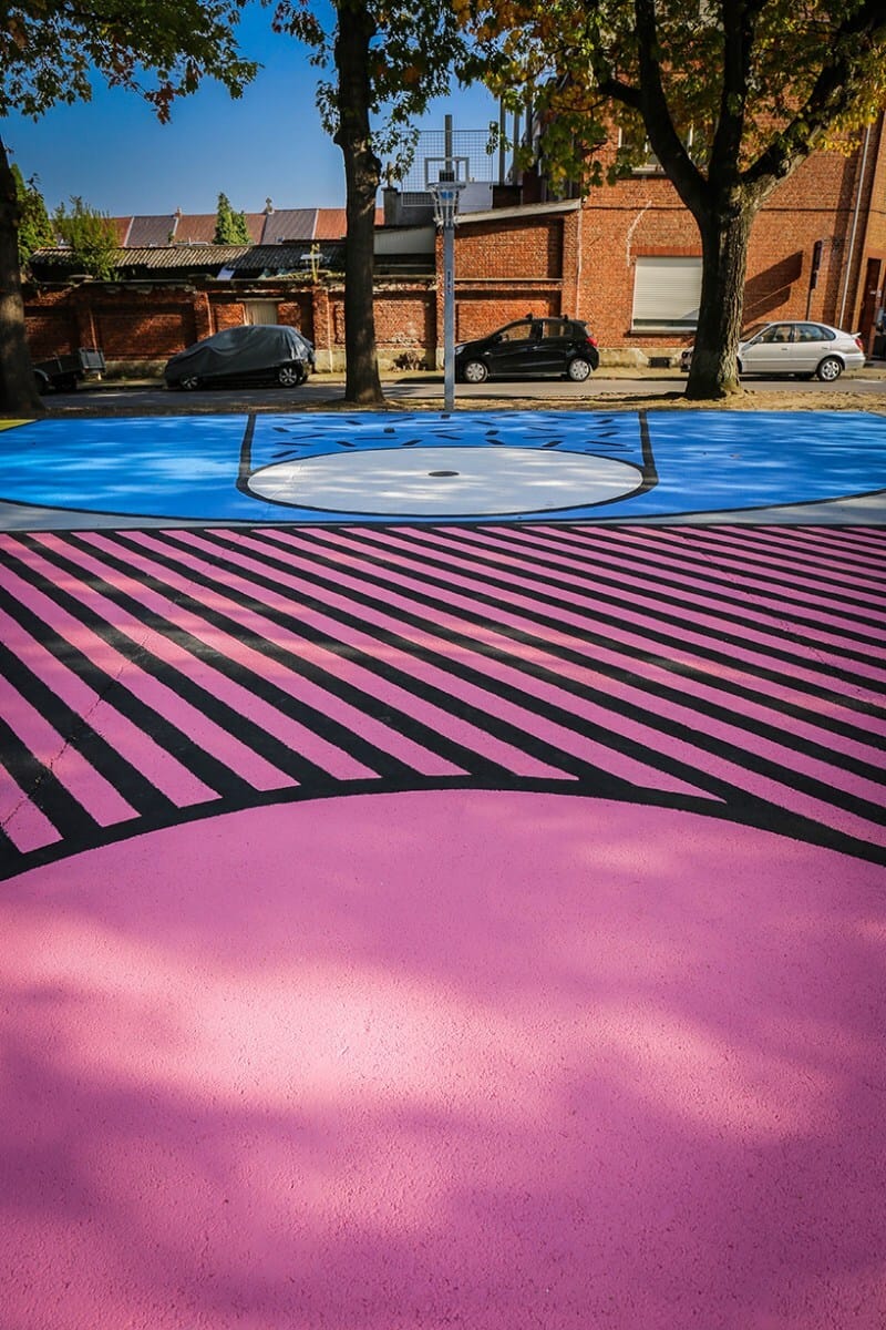 “I had to work within the rectangle of the court, that was the natural canvas and I also wanted to maintain the lines of the basket game,’ describes vanderlinden. ‘I like the fact that you can play the basketball game and that this design creates extra spaces for children to make up their own games. the colors are an ode to the memphis style, back in the 80s, when basketball and hip hop was booming.”