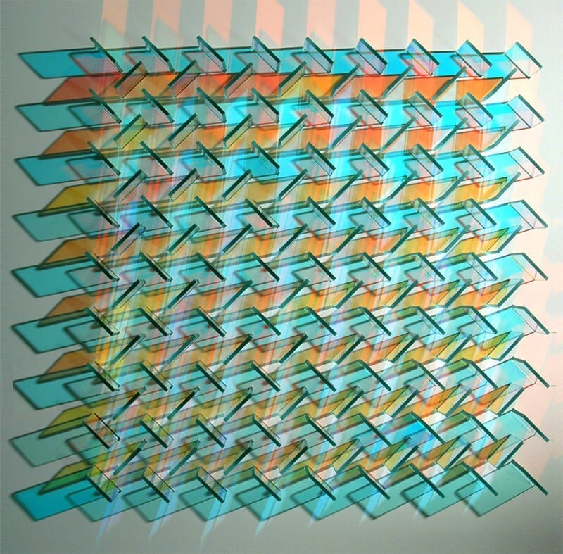 Dichroic glass is special because it displays two different colors, depending on how the light hits it. Artist and sculptor Chris Woods takes advantage of this property, with some beautiful geometric sculptures made up of glass squares. These radiating sculptures take on entirely different colors and moods depending on how you view them.