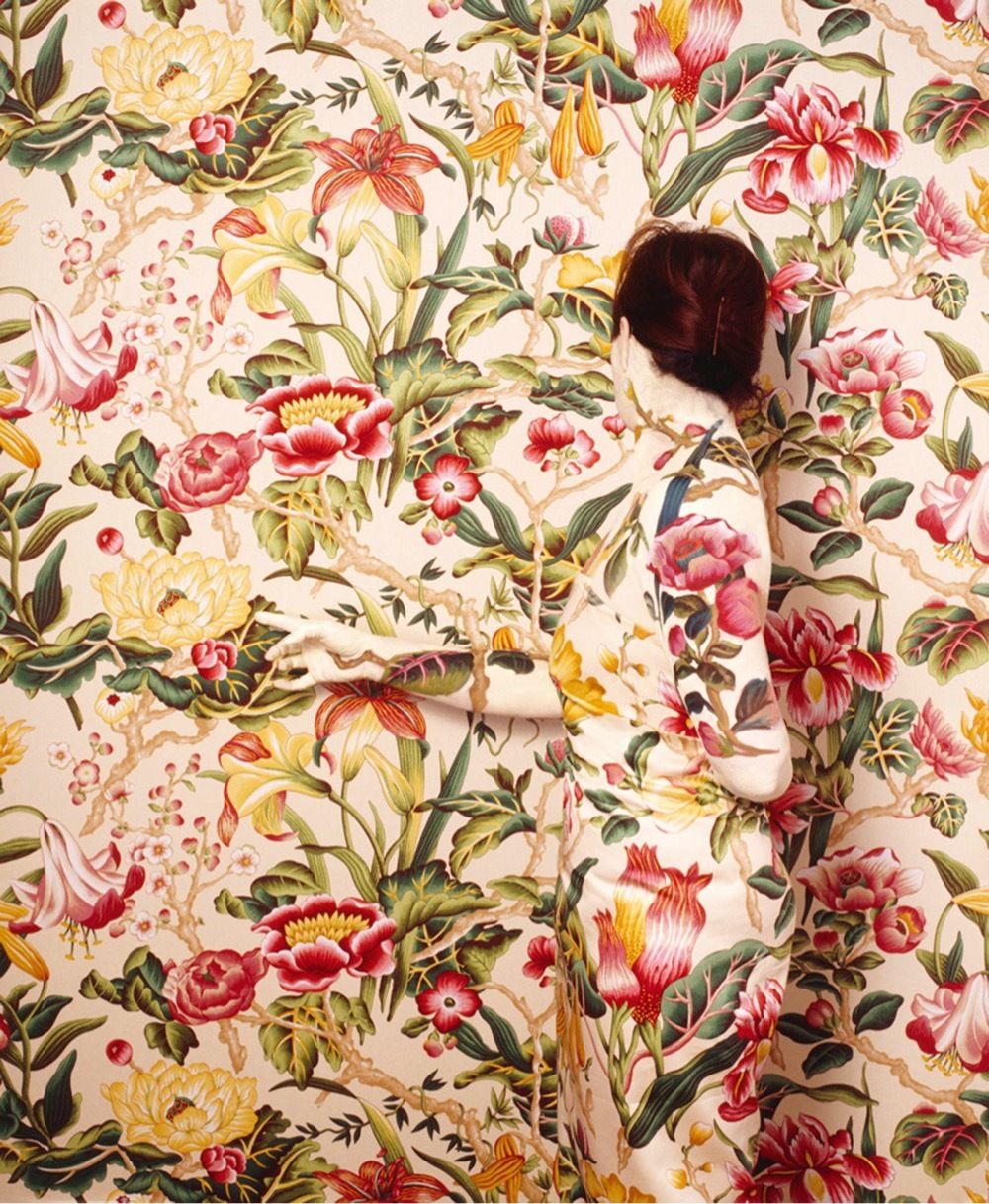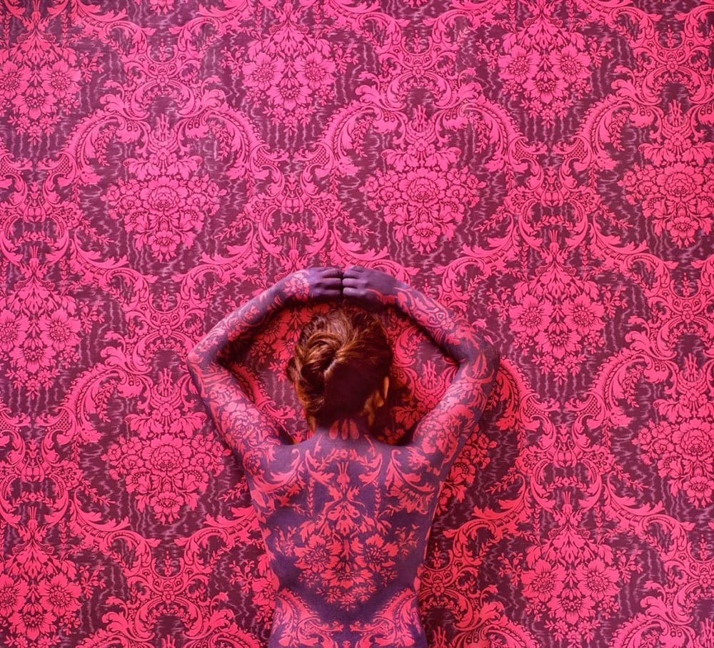 Artist Cecilia Paredes has a gorgeous series where she creates self portraits, with a twist. She’s hidden herself in plain sight, using elaborate patterns of cloth, fabric, paint, and tapestries to hide everything but her head.