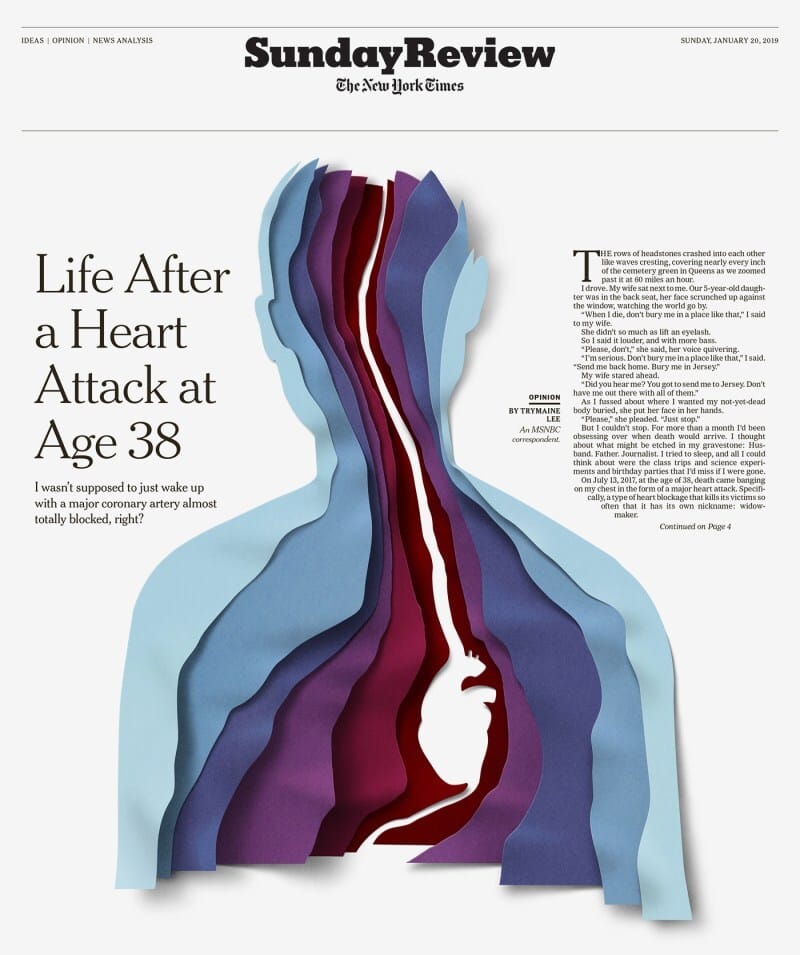 Published in The New York Times and the Washington Post among many others, his artwork is a great accompaniment to editorial articles, ranging from healthcare to science to urban living. The layered style, along with a shrewd sense of human form and silhouette, breathe life into his art, especially when some movement is added, like in the heart attack illustration below. See more of his beautiful art on Behance.