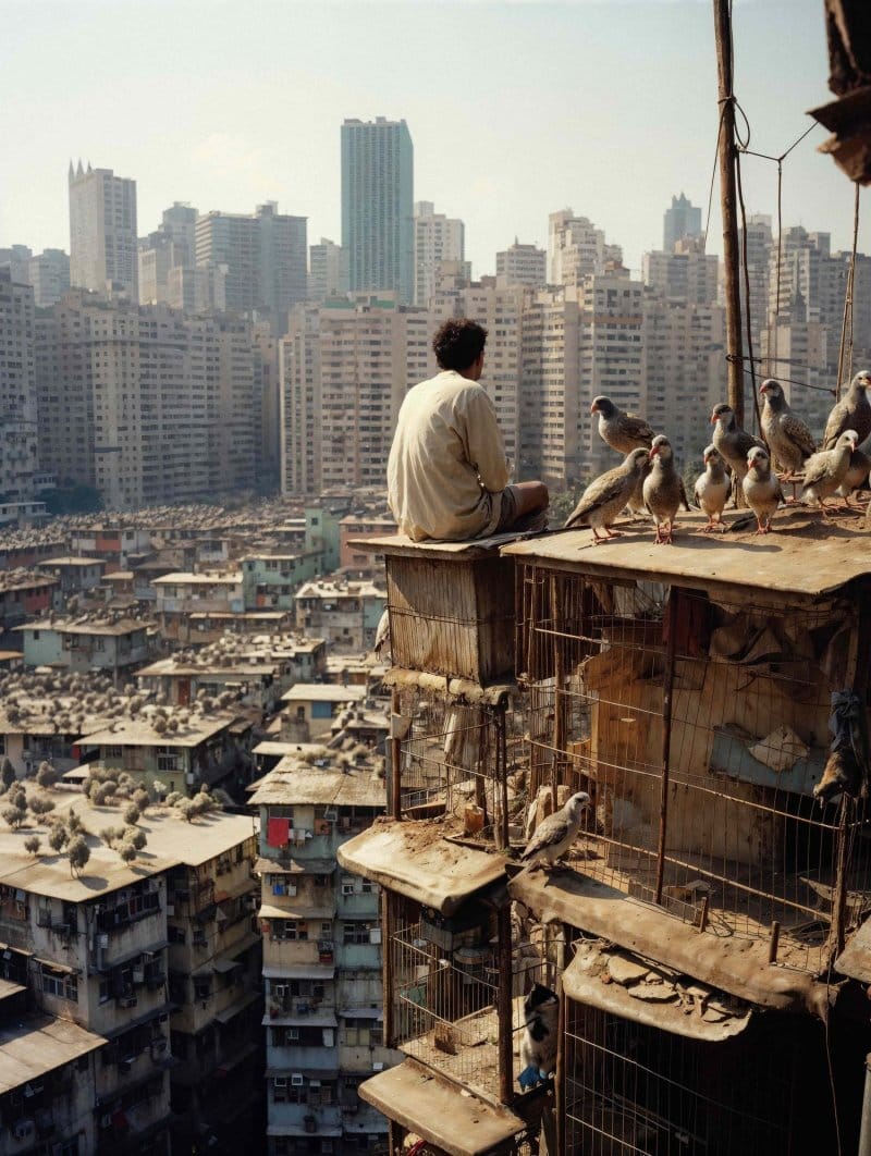 Children perched on suspended buildings, rooftops awash in pigeons, the images reflect a rough yet agreeably charming surreality.