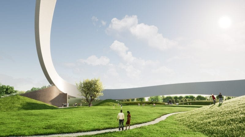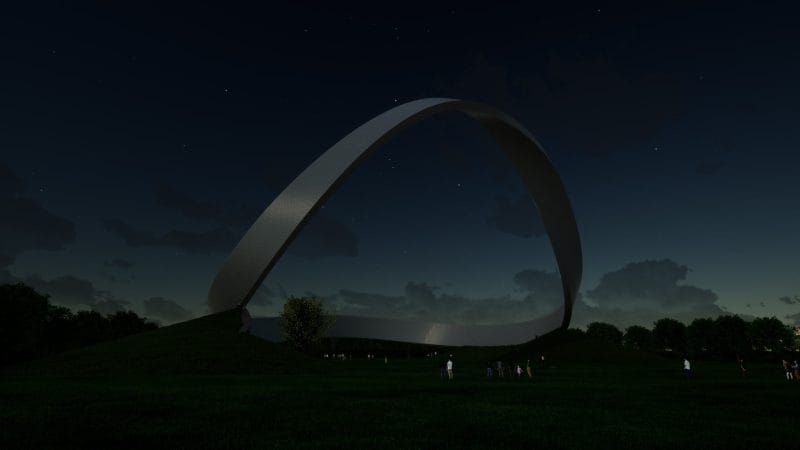 The monument’s looped form is meant to stand out from nearby motorways, rail lines, and even planes approaching the airport, making it visible to thousands every day.