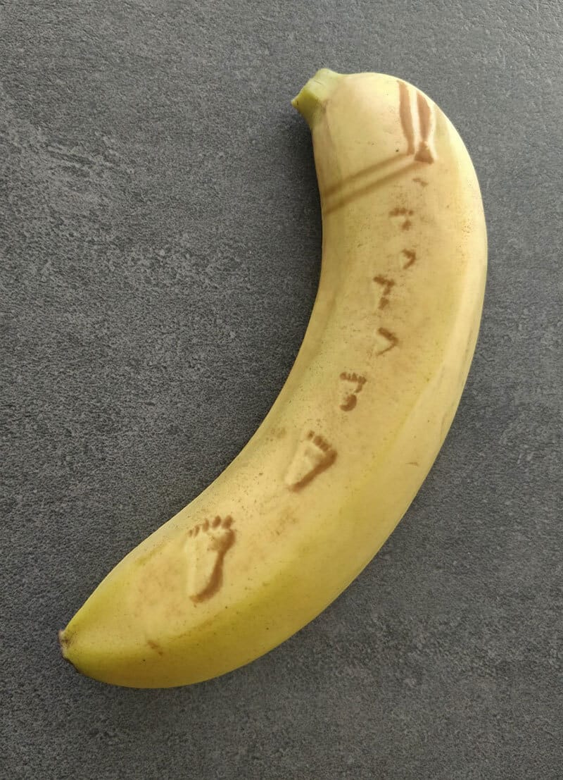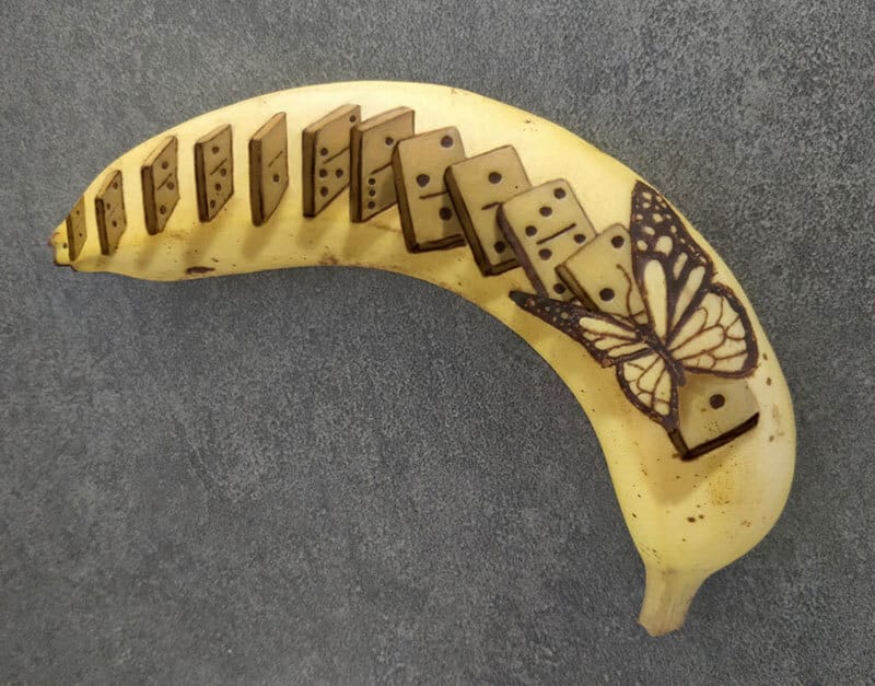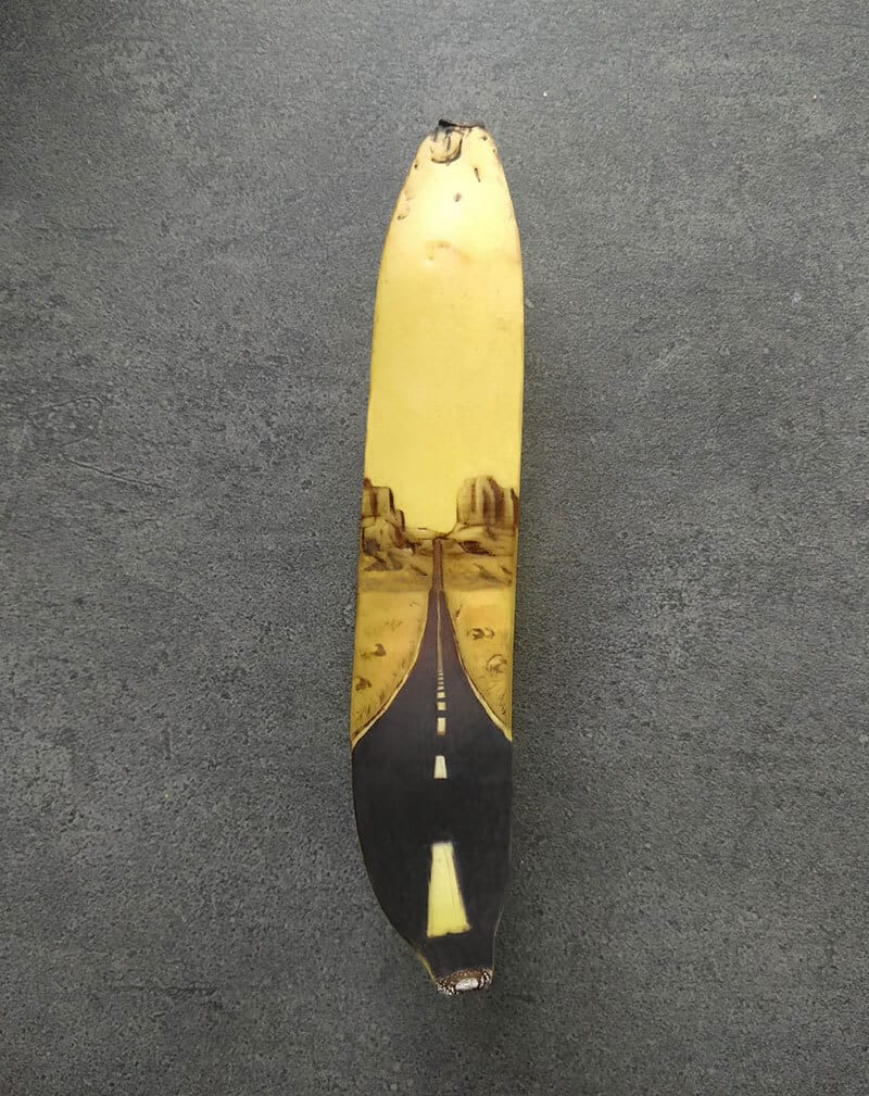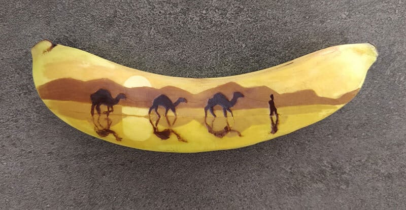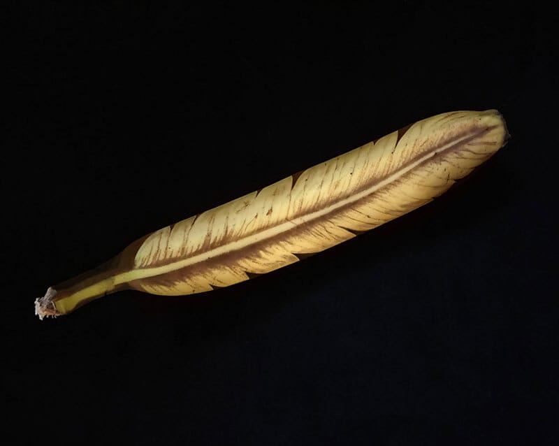 By simply bruising the banana peel in intricate ways, she’s able to create complex scenes, making great use of negative space.