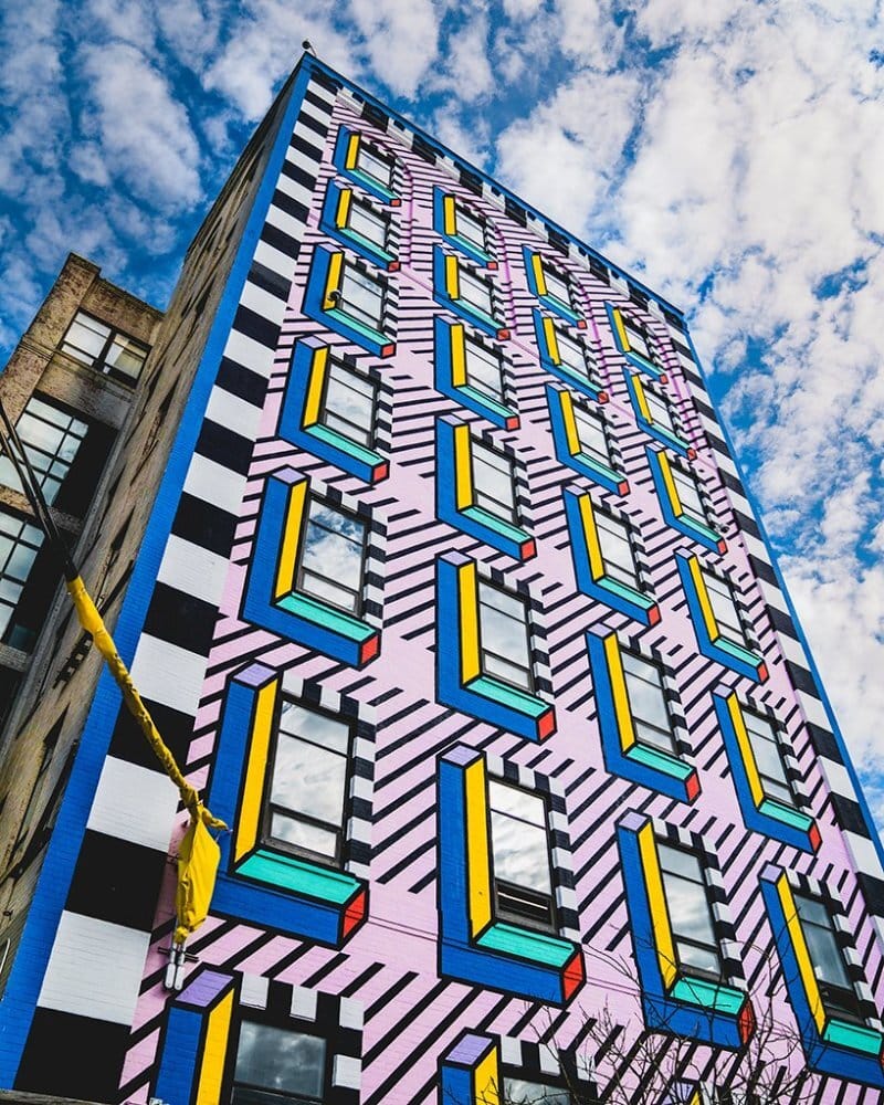 The Memphis Group was an Italian design collective founded by Ettore Sottsass, creating postmodern furniture and art in a distinctive colorful, patterned, pop-art style. The design style has ebbed and flowed over the last few decades, but has shown itself in some unusual places recently, including the entire facade of this seven-story historical building in Brooklyn, New York. Painter Camille Walala is the woman behind this bold and lighthearted affair, which brings a pop-art explosion of color and form to an old brick building. The blocky form and faux-depth make for an eye-catching design, turning the traditional exterior into something extraordinary. Via DesignBoom: