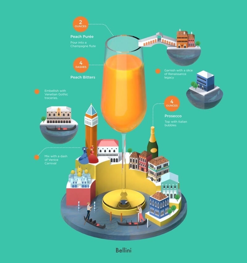 We’re both impressed and envious by Jing Zhang‘s cocktail infographics, we wish we had thought of such a clever concept. In her classic cocktail graphics, drinks like the Moscow Mule and Bellini are broken down by ingredient, but also by location, through elaborate details and cute graphical tidbits. The Sazerac, for example, is garnished with a lemon twist, and a slice of Southern American nostalgia. Her work is packed with fun detail, but also a level of creativity and charm that is rare in infographics today. It’s also a legitimate cocktail recipe guide. Great stuff! Via Behance: