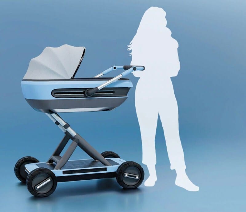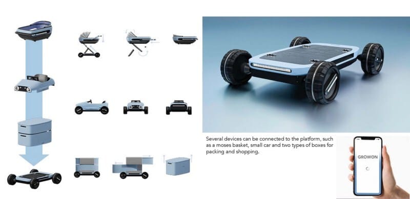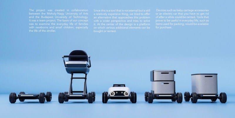 The sturdy, electric-wheeled platform is modular, and accepts a range of accessories, from a stroller to a toy car, to a system of storage, and more.