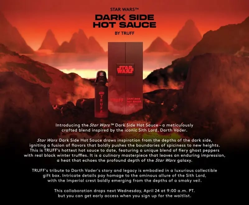 Their special edition Star Wars sauce features fiery ghost peppers with real black truffles, and comes in a very cool Darth Vader bottle. What could be hotter?