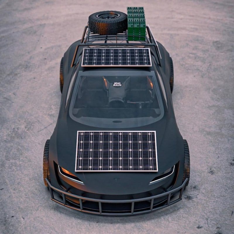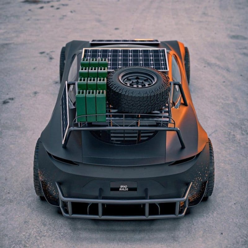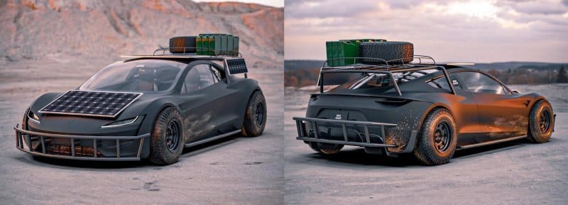 Tesla’s upcoming Roadster, capable of going 0-60 in 1.9 seconds, will be an electric speed demon unlike any other. At $250,000, it will be faster than supercars costing ten times the price. Surviving an apocalypse, though, it might not, at least in its current form. Digital artist and car enthusiast BradBuilds has a rendering for a ‘Desert Apocalypse’ Roadster, modded to include solar panels, guard rails, water jugs, and gnarly heavy-duty tires.