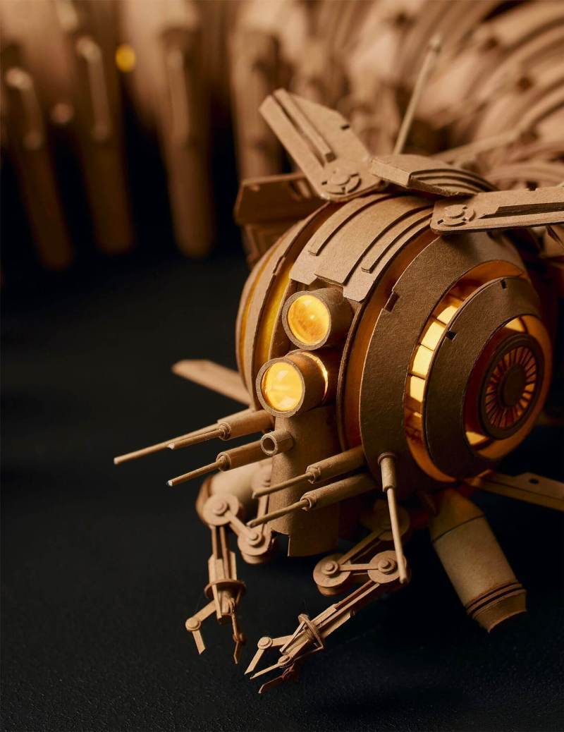 Fantastical flying creatures embody a machine-like aesthetic, and have built-in lights to add to their appeal.