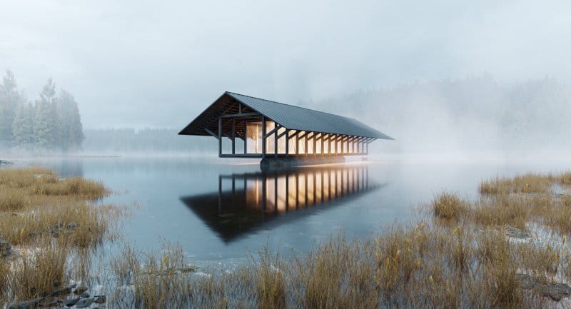 Perched over the water of Crystal Lake, New York, this slim pavilion serves as a place for yoga classes, meditation, and group therapy. Designed by Marc Thorpe, the structure is anchored to the lakebed by a single concrete pier, which helps gives the illusion of the entire structure floating atop the water.