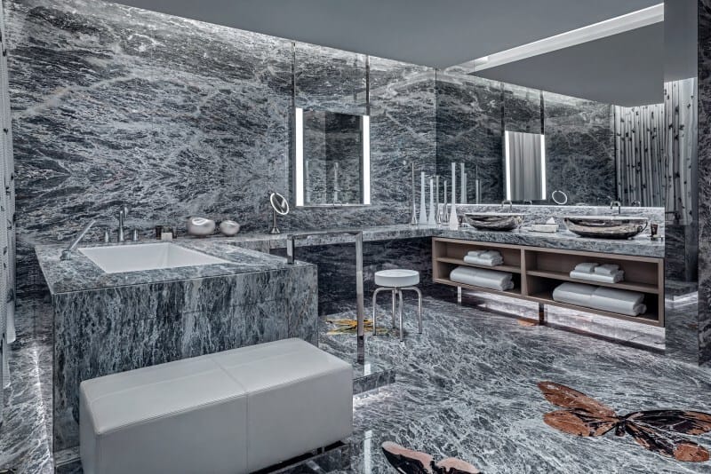 The 2.5 bathroom suite is elegant, but also goofy and absurd, blending luxury and humor.
