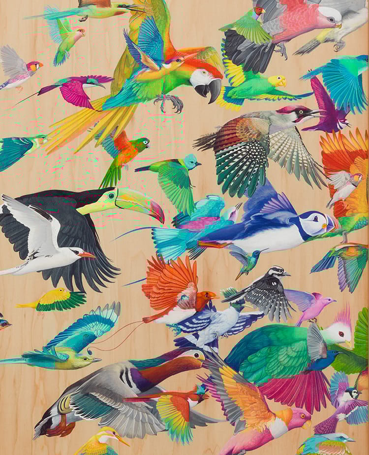 The hyper-detailed paintings of insects and animals by Tiffany Bozic are made more organic and interesting by her choice of maple panels as canvasses. Not only do the natural lines and grain of the wood add visual interest, but Bozic embraces the texture and lines of the grain, using it as features in some of her series, entitled Spectrum. Really pretty and fascinating work. On display at the Joshua Liner gallery in New York.Via Notcot: