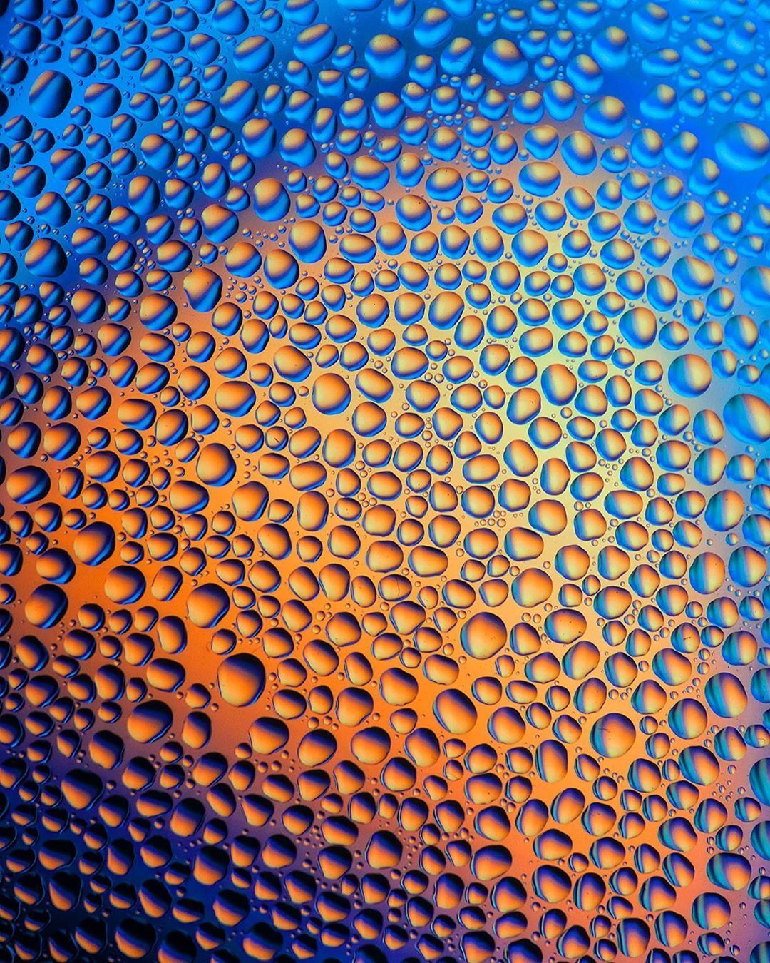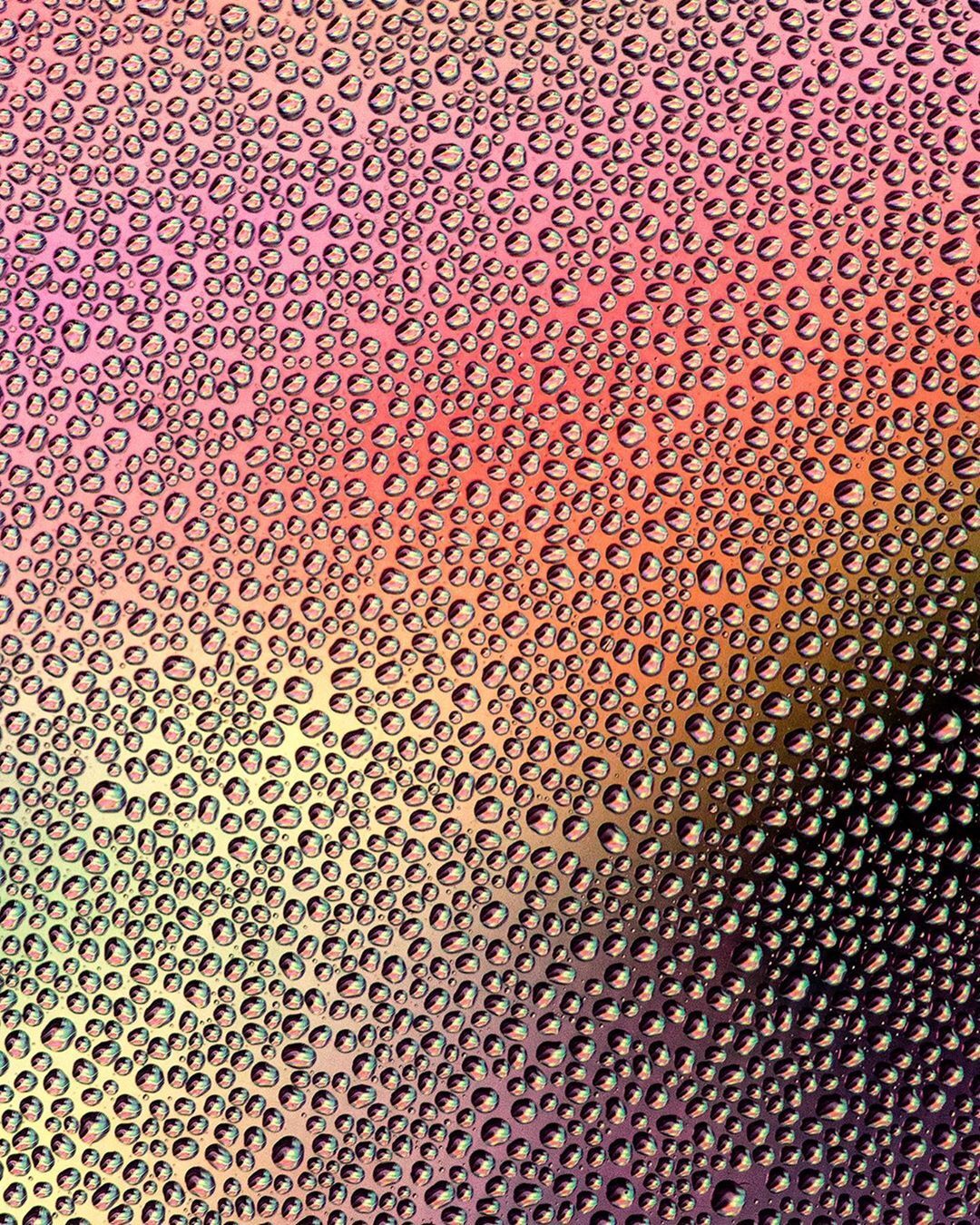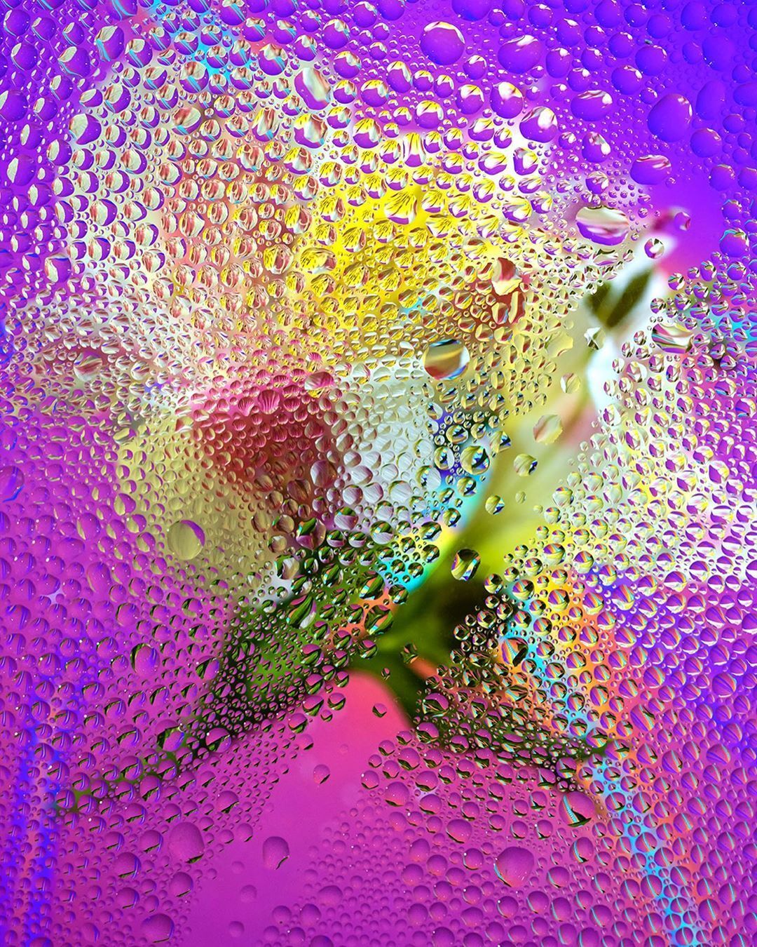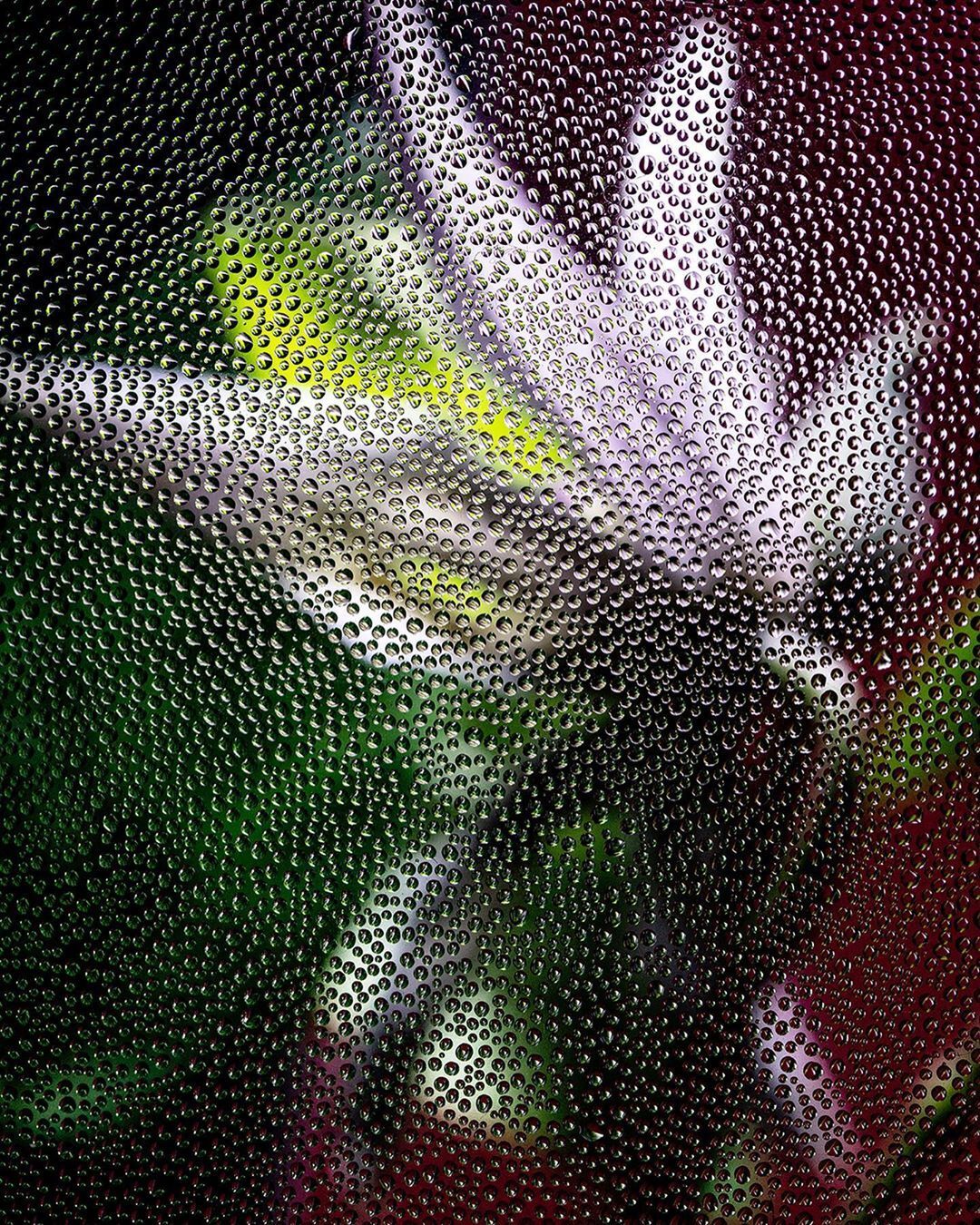 His colorful pieces show voluptuous droplets against a pane of glass, with vibrant color reflecting through the droplets. In some of them we can see flowers behind the glass, and in others the subject is obscured entirely, adding to the mystery of the series.