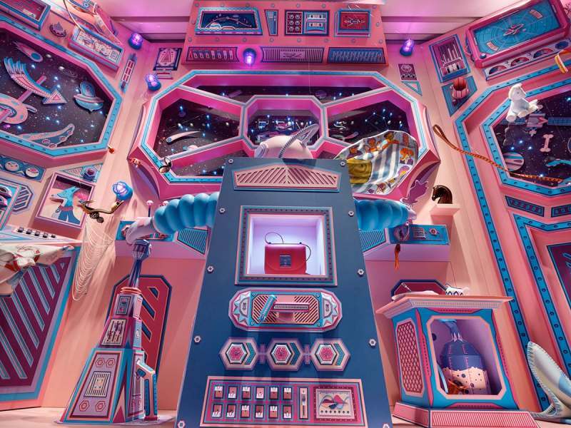 Entitled Journey of a Lifetime, the window display is full of artistic touches of an old timey astronaut, with a myriad of knobs and switches, all in their trademark vibrant tones.