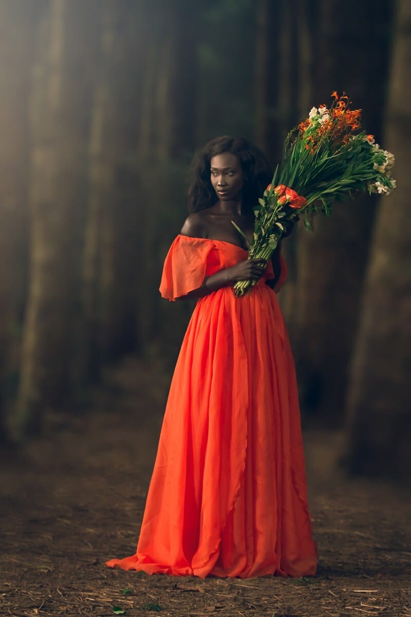 Kenyan photographer Victor Peace has a lovely series of fashion/beauty photography featuring model Hivita Rogato, who has a stunning skin tone and natural beauty. Wearing a poppy-colored dress and holding complimentary flowers, she’s photographed in a forest setting, with soft light illuminating her face. Really nice work, via Behance: