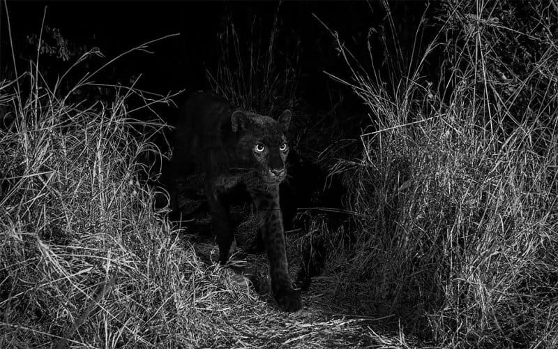 Kenya-based biologist Nick Pilfold heard that the rare black cat might be in the area, and set up a number of camera traps, in hopes of getting a glimpse. What he got were some truly beautiful images of the female leopard, quietly stalking the grasslands at night.