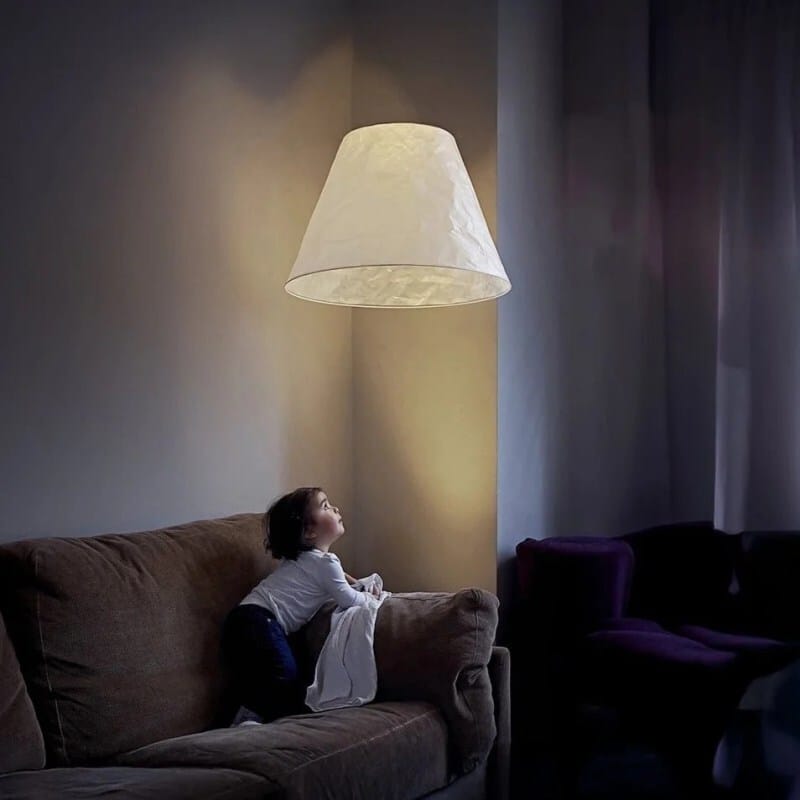 The lampshade itself is suspended from the ceiling by wires so thin they feel imaginary, and the light source originates from a discreet LED on the floor. That upward light gently fills the paper form with a soft glow that feels like sunlight at dusk.