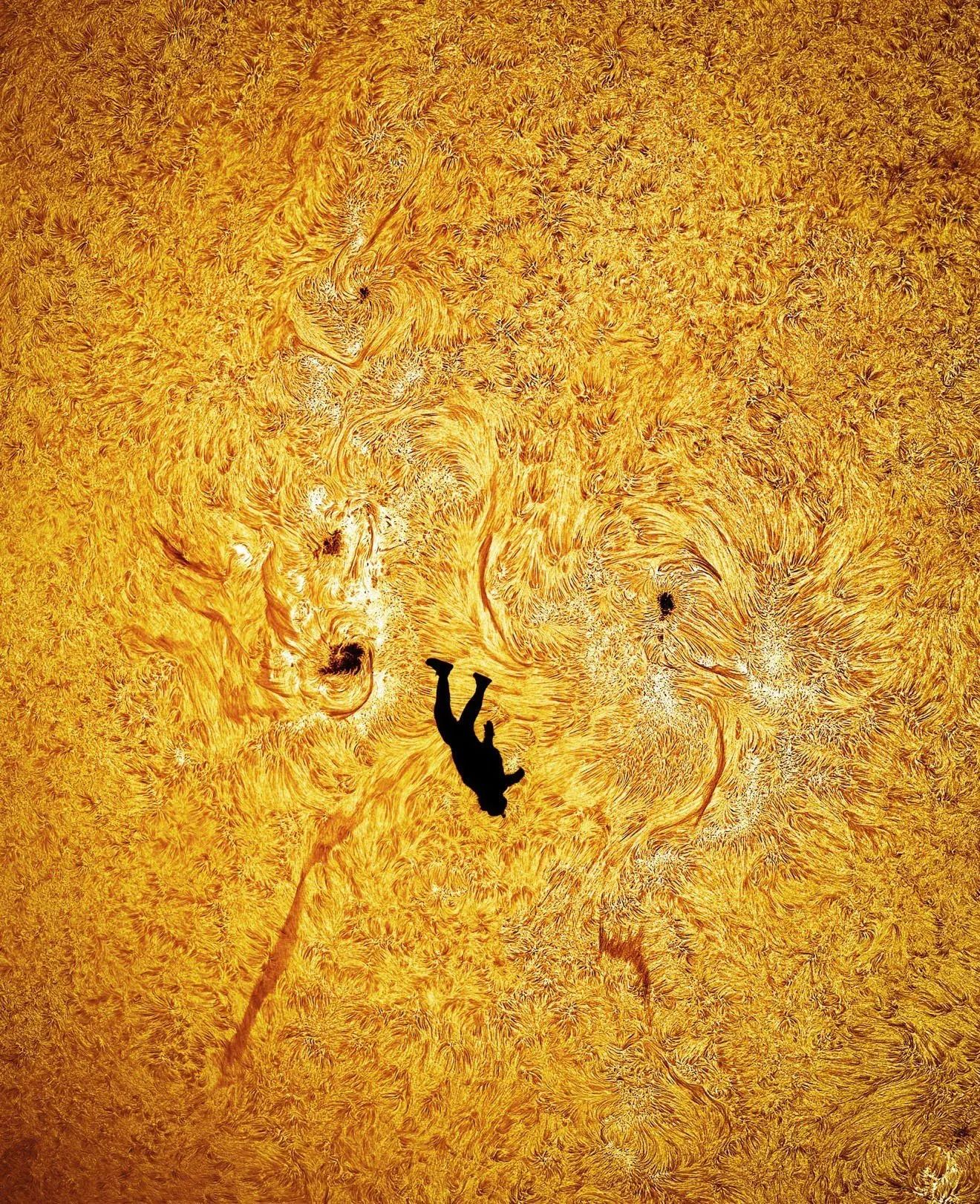Titled “The Fall of Icarus,” the image pairs a razor-sharp solar mosaic with the upside-down silhouette of friend and collaborator Gabriel C. Brown, captured over the Arizona desert.