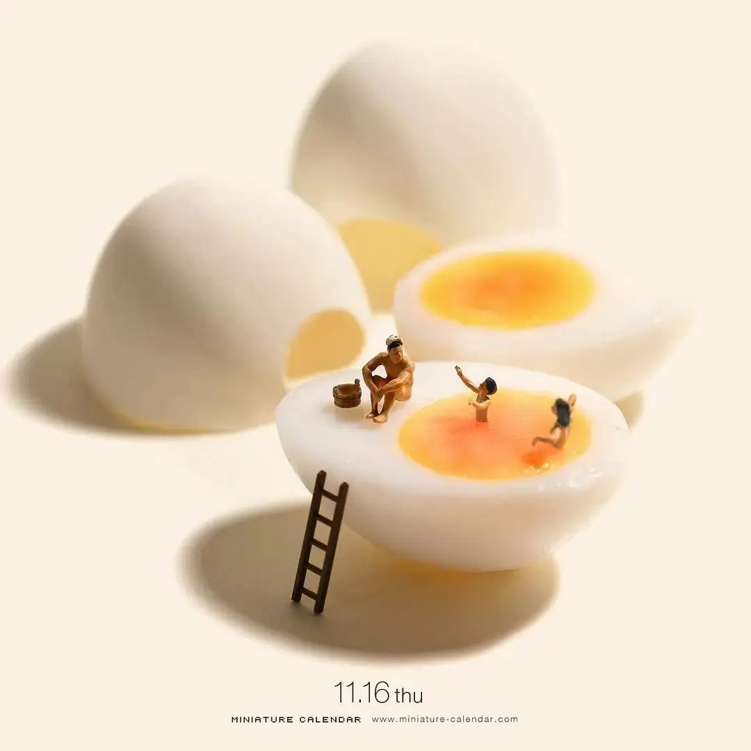 Some of his recent pieces include divers jumping off clothespins into terry towel pools, hard boiled eggs that become soaking pools, ice fishermen dropping a lure into a broken phone screen, and even a surfer catching some awesome waves made of fried rice.