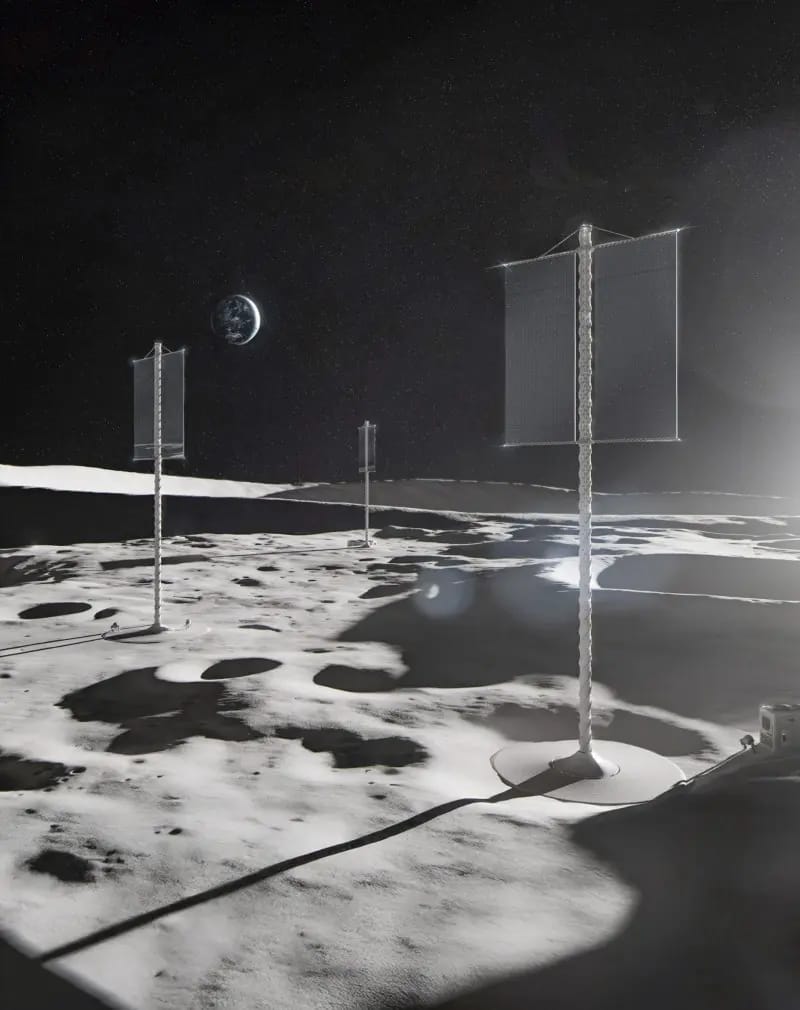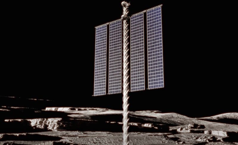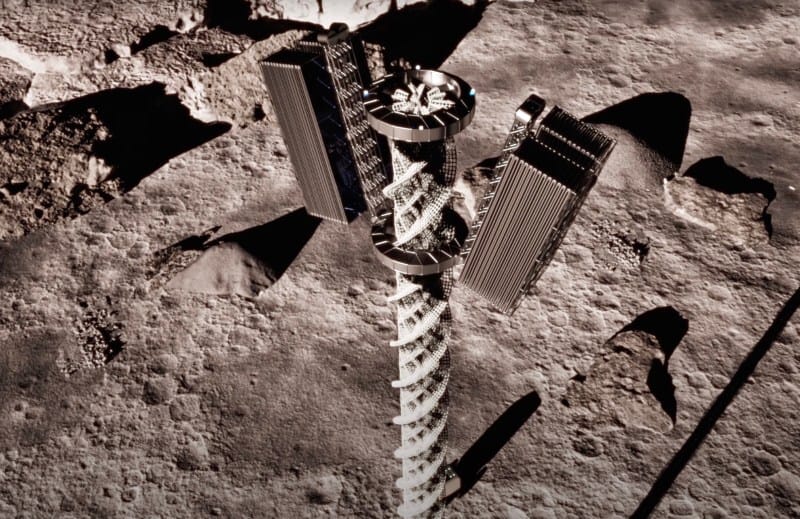 Designed for a future moon outpost, the solar arrays are designed to rise up from a spiral, 3D-printed tower, and extend sail-like solar panels.