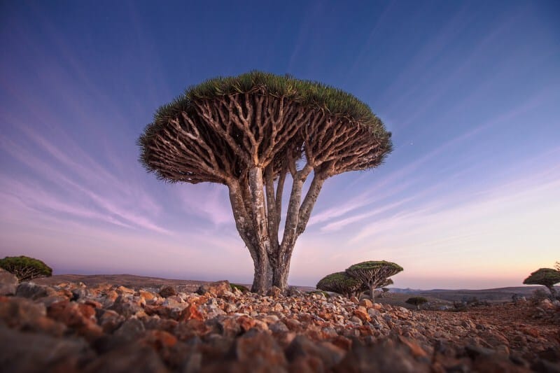 We’ve always loved the highly unusual, wildly-named Dragon’s Blood Tree, which lives only on the archipelago of Socotra, located in Yemen. The scientific name is Dracaena cinnabari.