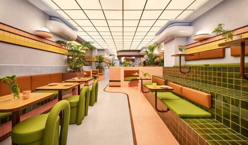 Designed by Spanish firm Masquespacio, the space combines tile and built-in seating with playful plant stands, diner tables, and colorful plants.