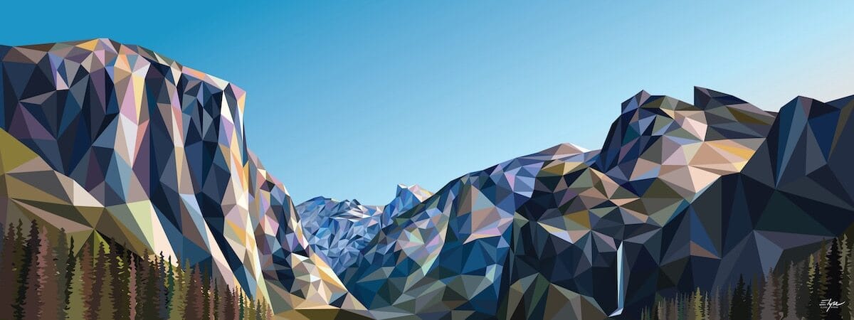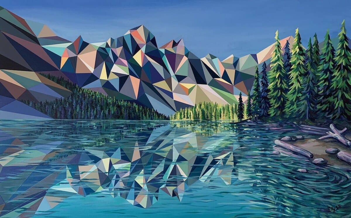 Some of the hand painted geometric mountains seem computer-created, almost like they haven’t finished rendering. Others appear like twinkling gems reflecting off of the water below.