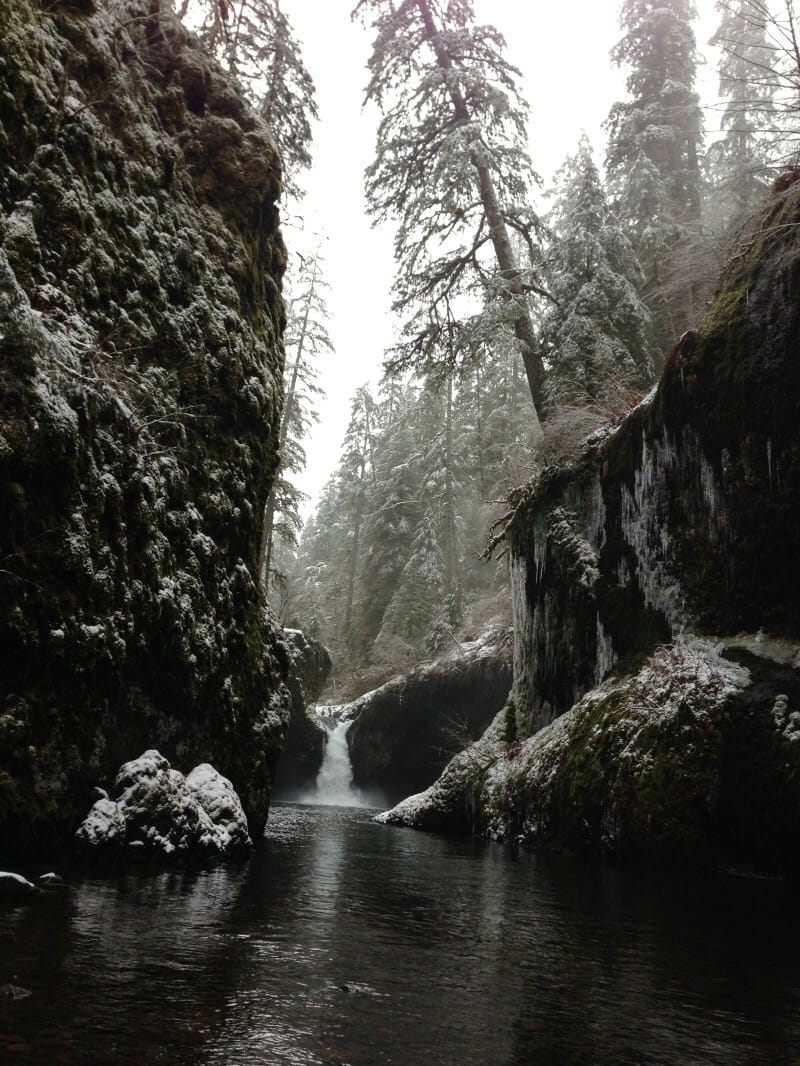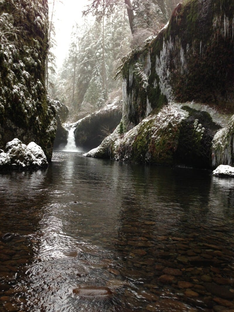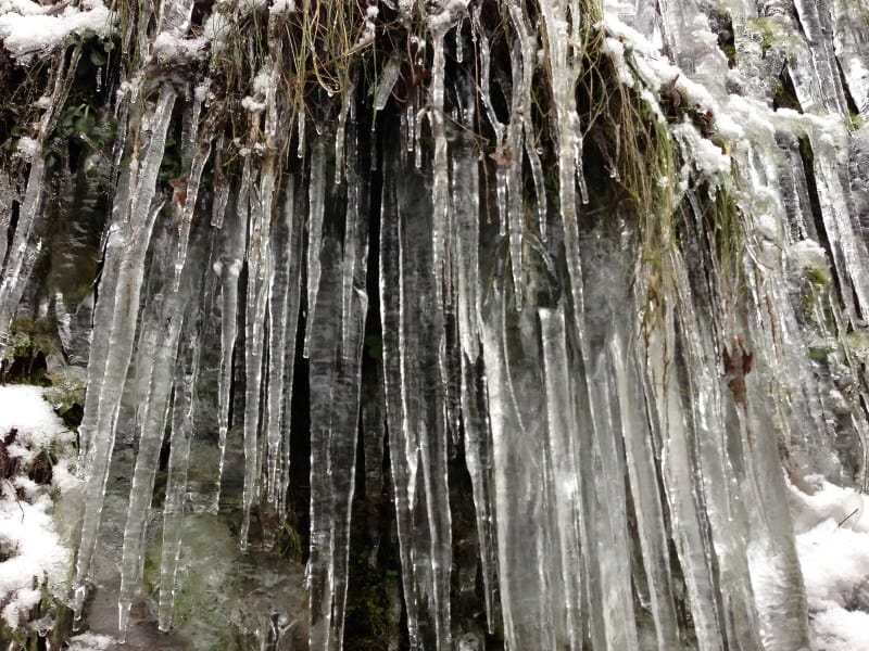 I took a great little hike this past weekend with my friend Trevor. Walls of icicles met us on our path, and with temperatures around 36° F, whole sections of frozen daggers began falling down along the narrowest portion of the trail. You didn’t want to look down or up, but just hope you escaped the icicle alley unscathed. It was exciting.