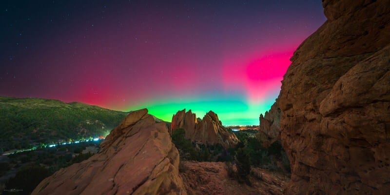 The photos below showcase the extent of the vibrant aurora, which look astounding behind the craggy rock formation outside of Colorado Springs.