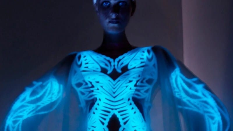 Made from over 125 million algae, the dress comes alive in the dark, and with the wearer’s movement.