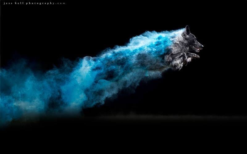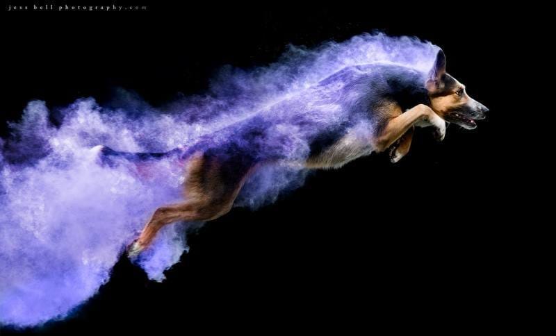 Photographer Jess Bell has a striking and supernatural series of dog photos, where dogs appear to leap out of glowing flames or fog. The Ontario-based photographer actually uses colored powder (non-toxic, of course) to dust the dogs mid-leap, making them appear to erupt out of vibrant clouds.