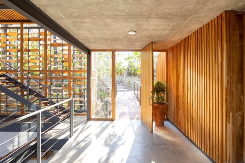The home is full of expansive glass views and a huge overhanging roofline. Louvered wall shades made of teak help the house stay cool in the tropical heat.