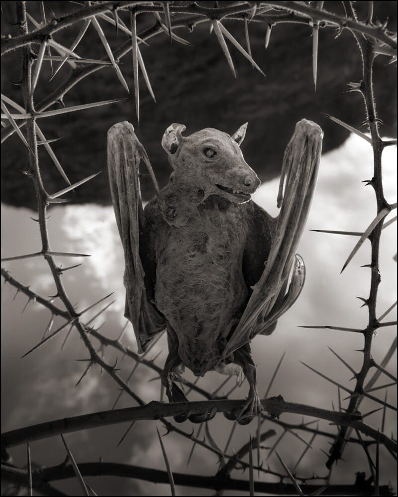 I unexpectedly found the creatures – all manner of birds and bats – washed up along the shoreline of Lake Natron in Northern Tanzania. No-one knows for certain exactly how they die, but it appears that the extreme reflective nature of the lake’s surface confuses them, and like birds crashing into plate glass windows, they crash into the lake. The water has an extremely high soda and salt content, so high that it would strip the ink off my Kodak film boxes within a few seconds. The soda and salt causes the creatures to calcify, perfectly preserved, as they dry.