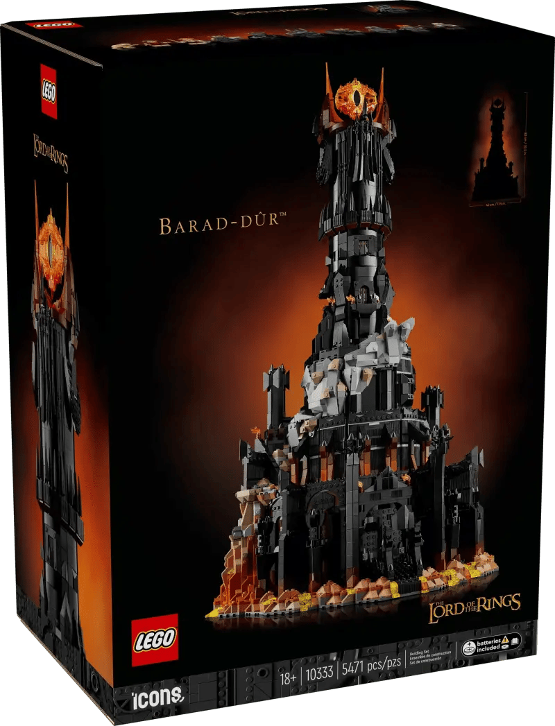“Journey to Middle-earth with the LEGO® Icons The Lord of the Rings: Barad-dûr model. This impressive movie memorabilia set is bursting with features that fans will adore and depicts the ominous fortress with its soaring tower elevating the Eye of Sauron high above Middle-earth. The set also comes with 10 minifigures, including Sauron, Mouth of Sauron, Gothmog, Orc, Frodo, Sam and Gollum.
