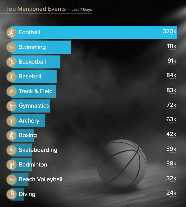 CXM company Sprinklr offers a look at the Tokyo Olympics, with a dashboard of live data visualizations, showing what people are excited about.