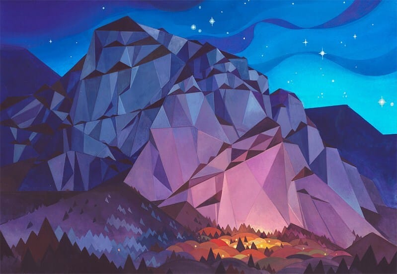 Canadian painter Laura Bifano paints landscapes in warm tones, but puts her own geometric spin on them, creating a look and feel all her own. Inspired by hiking her native Canada, but also by the geometric backgrounds from video games, we really like the style of her art, and the gem-like rock formations. Via IG: