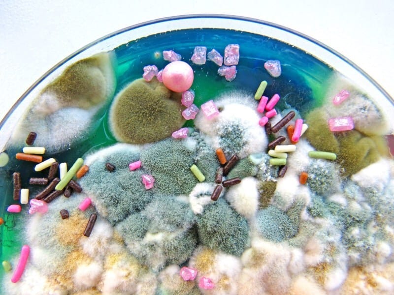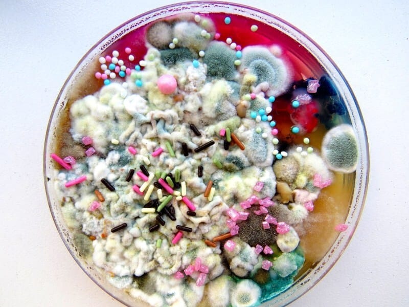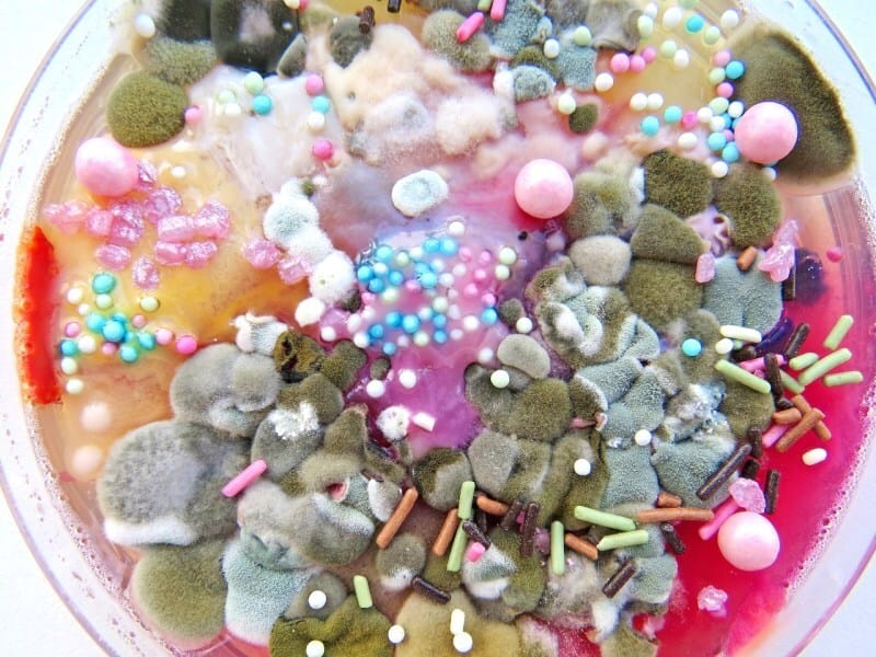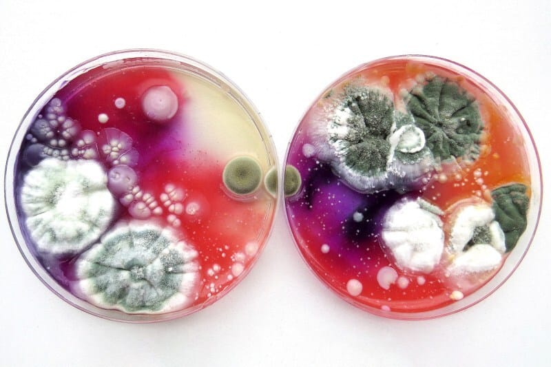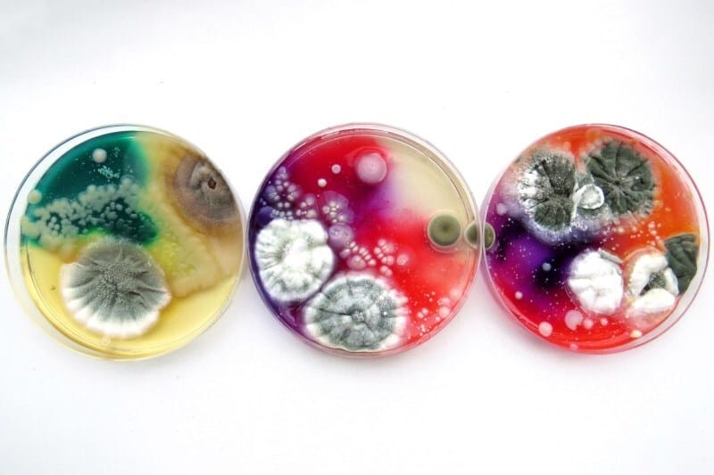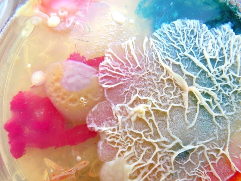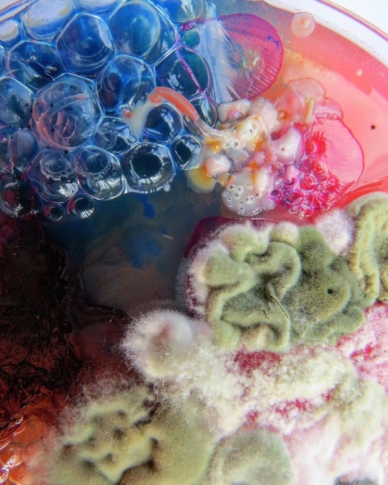 These hyper-vibrant moldscapes are the work of Dasha Plesen, combining paint, food, cultures and bacteria to create Petri dish masterpieces.