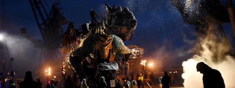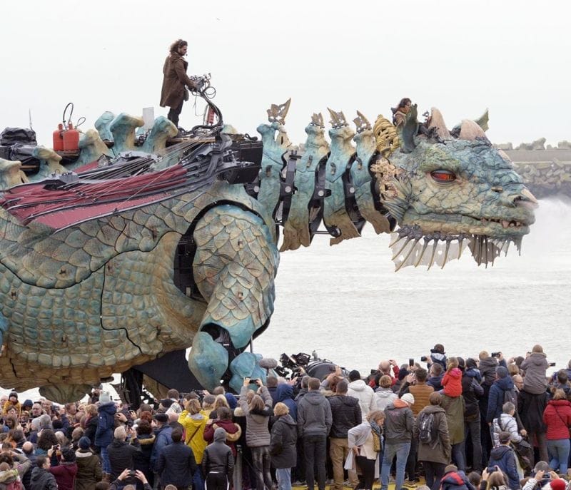 “Freed from the subterranean worlds, the Dragon of Calais is heading for the city,” say the makers. “This new creation built by La Machine Company will roam the city, manipulated by 17 people who give him life.”