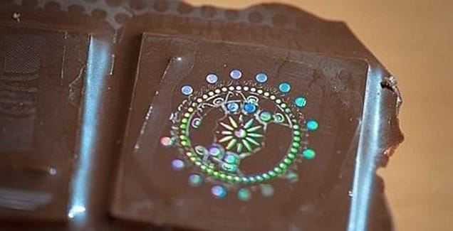 Yum, both visually and taste-wise. Scientists from a Swiss company called Morphotonix have figured out how to print holographic designs onto chocolate bars without using any inks or dyes. Via NPR: