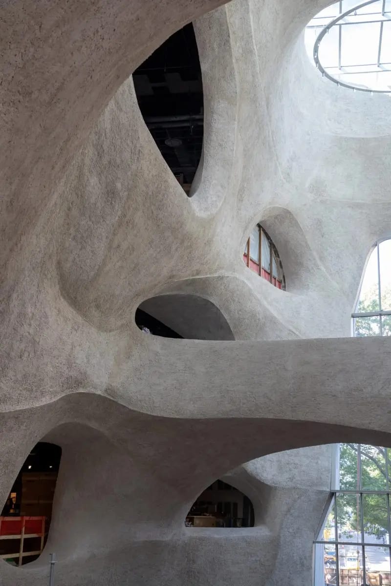 The building’s undulating forms are made using sprayed concrete, giving it a cave-like, organic appearance.