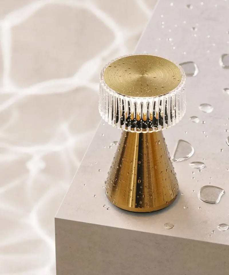 Available in a range of finishes, the small lamp features a brushed aluminum body with a ribbed, crystal-like polycarbonate shade, which helps refract the light.